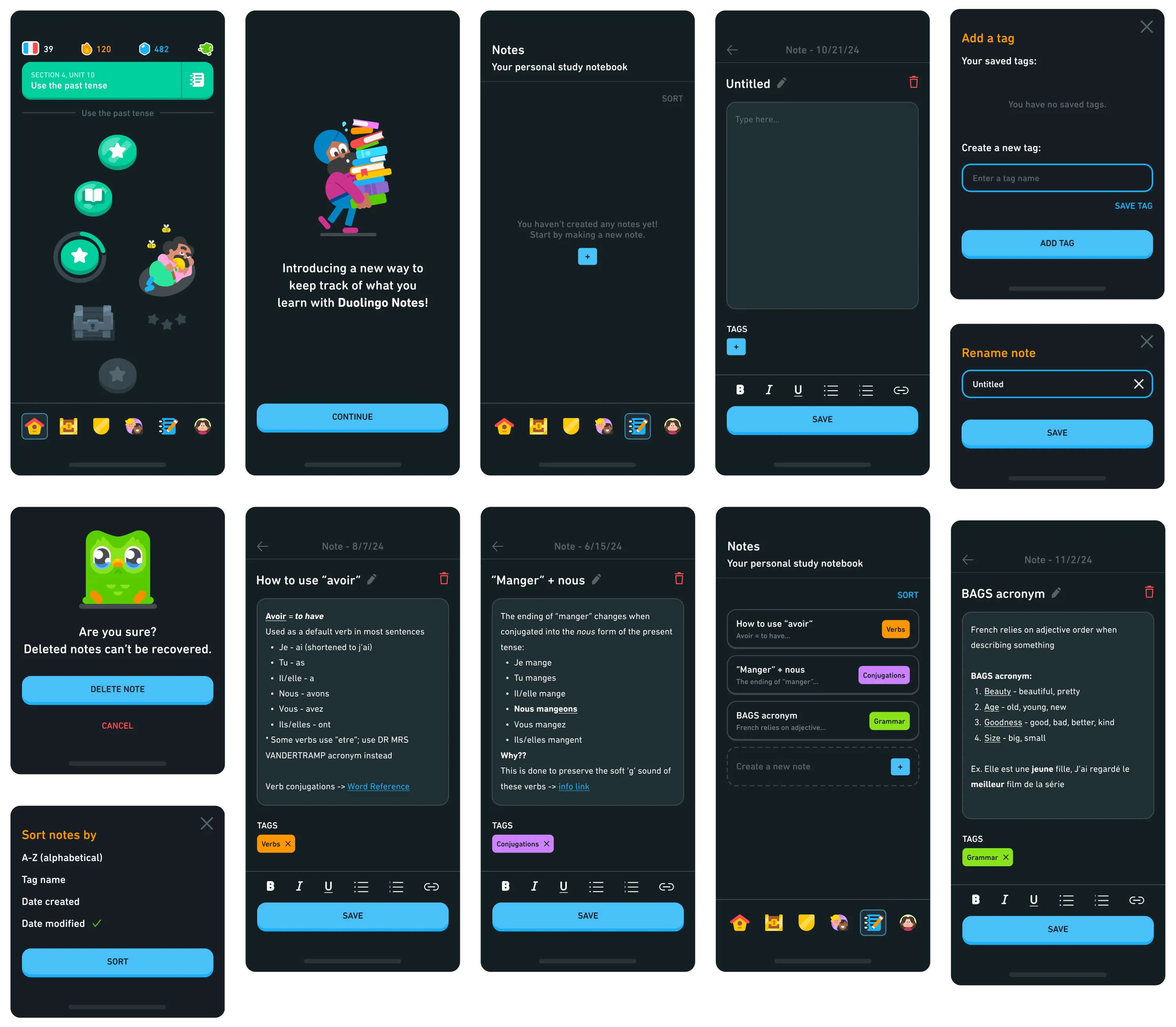 Duolingo Notes is a note-taking feature that simulates being able to make your own notes within the Duolingo app. It uses the same visual style and interactions as a basic notepad or notes app, as found on many mobile devices. Tags can be added to categorize notes, completely user-controlled and definable according to their needs. Not only does a note-taking system better help users retain learning material and reduces the need to redo lessons, but also re-introduces habits that were present during their education.