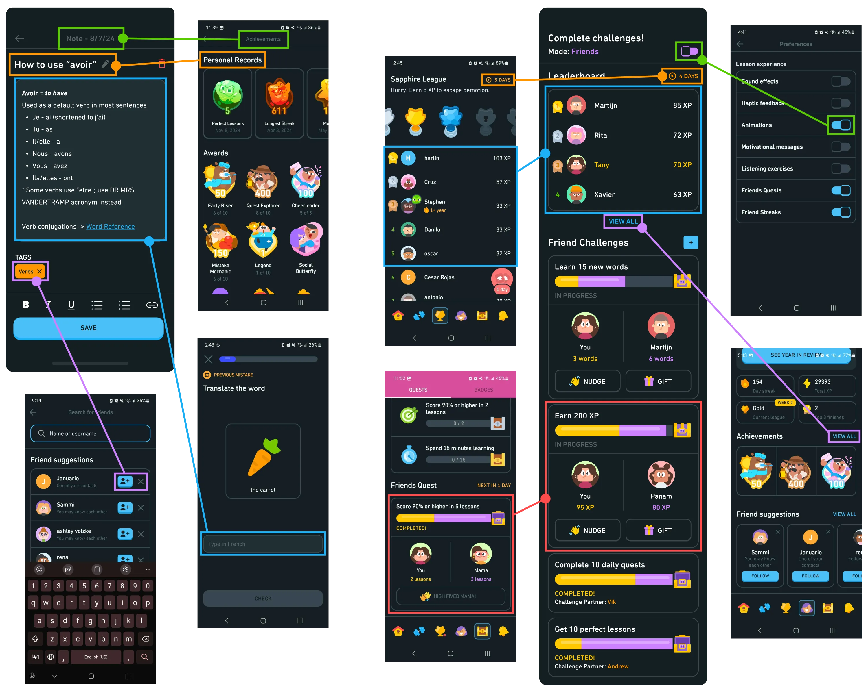 Learning with Friends expands the current system for using Duolingo with added friends. Although Duolingo allows you to connect with other users, there are limited interactions aside from app-controlled challenges/quests and maintaining a streak; conversely, having no friends on the app means users miss out on collaborative learning experiences. With the expanded system, users can now select custom challenges and invite their friends to participate; healthy competition and rivalry is encouraged through a friends-only leaderboard.