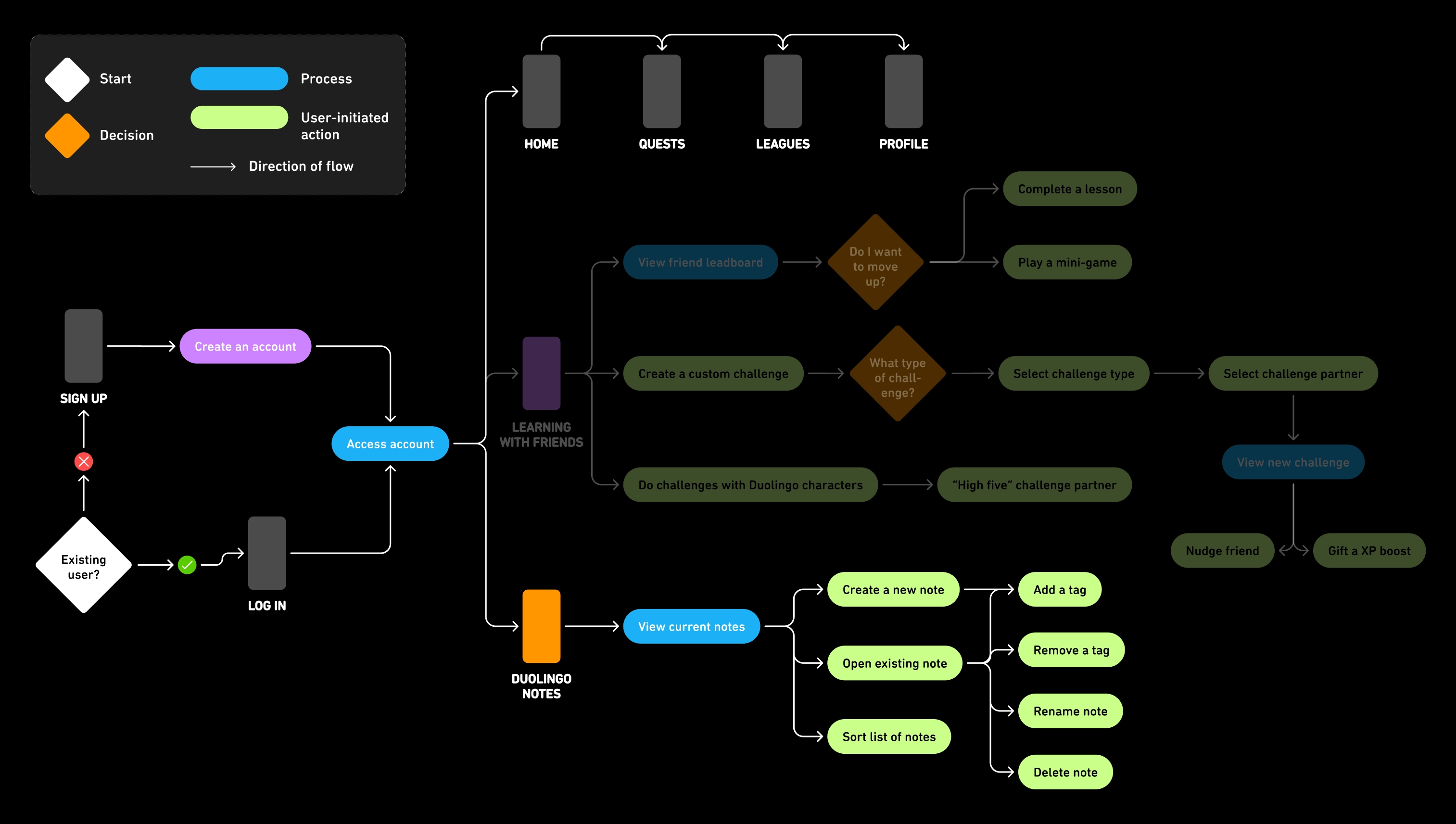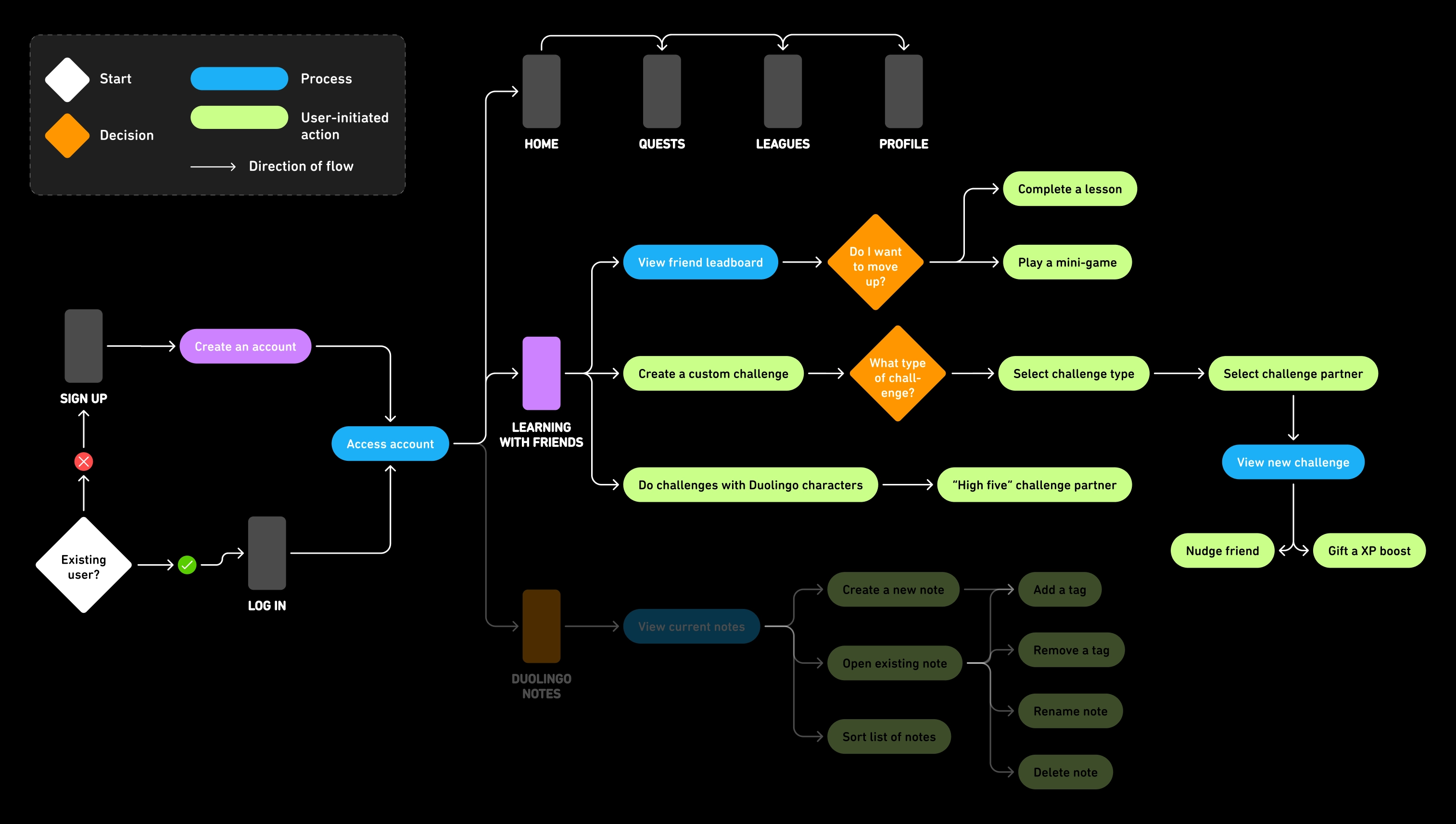 From here, I started examining the current structure of Duolingo through a service blueprint to understand how users currently interacted with a simple task such as opening the app and completing a lesson. This high-level breakdown was used to identify where changes could be make based on feedback from users.