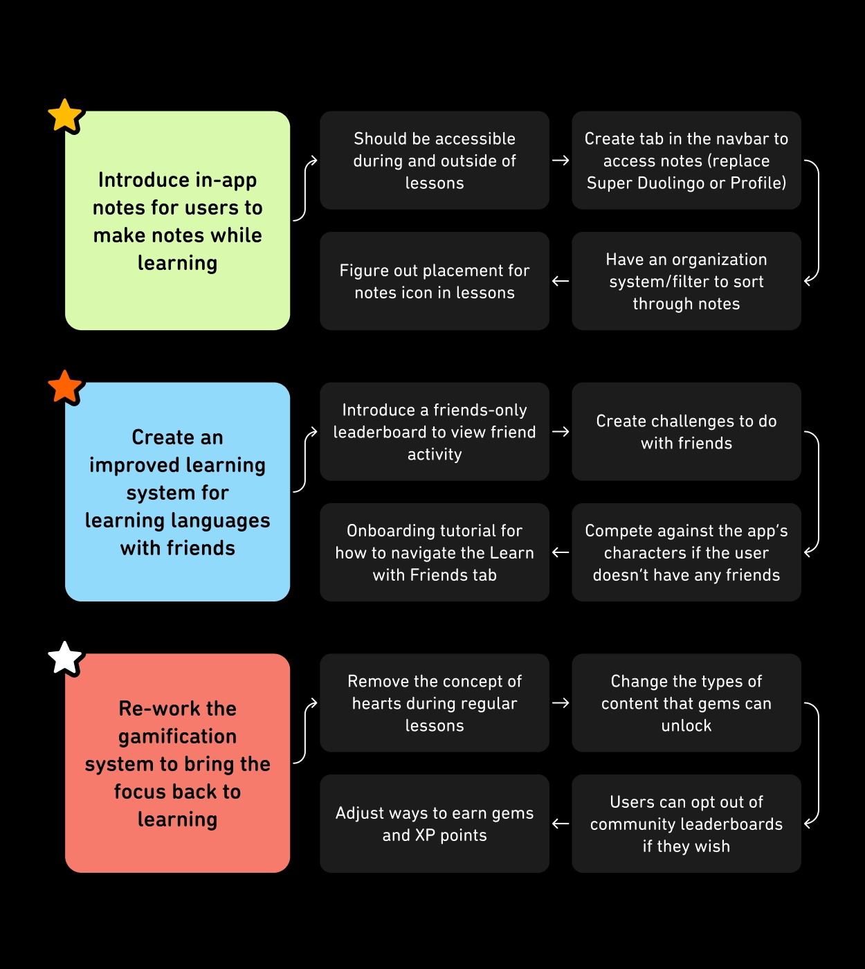 Using a priority matrix, potential changes to Duolingo's current user experience were ranked based on importance and their impact on the app; of these changes, three were selected to move onto the next phase of development. Due to the timeline provided for the project, the selected choices were scaled down to two with the third as a back-up option.
