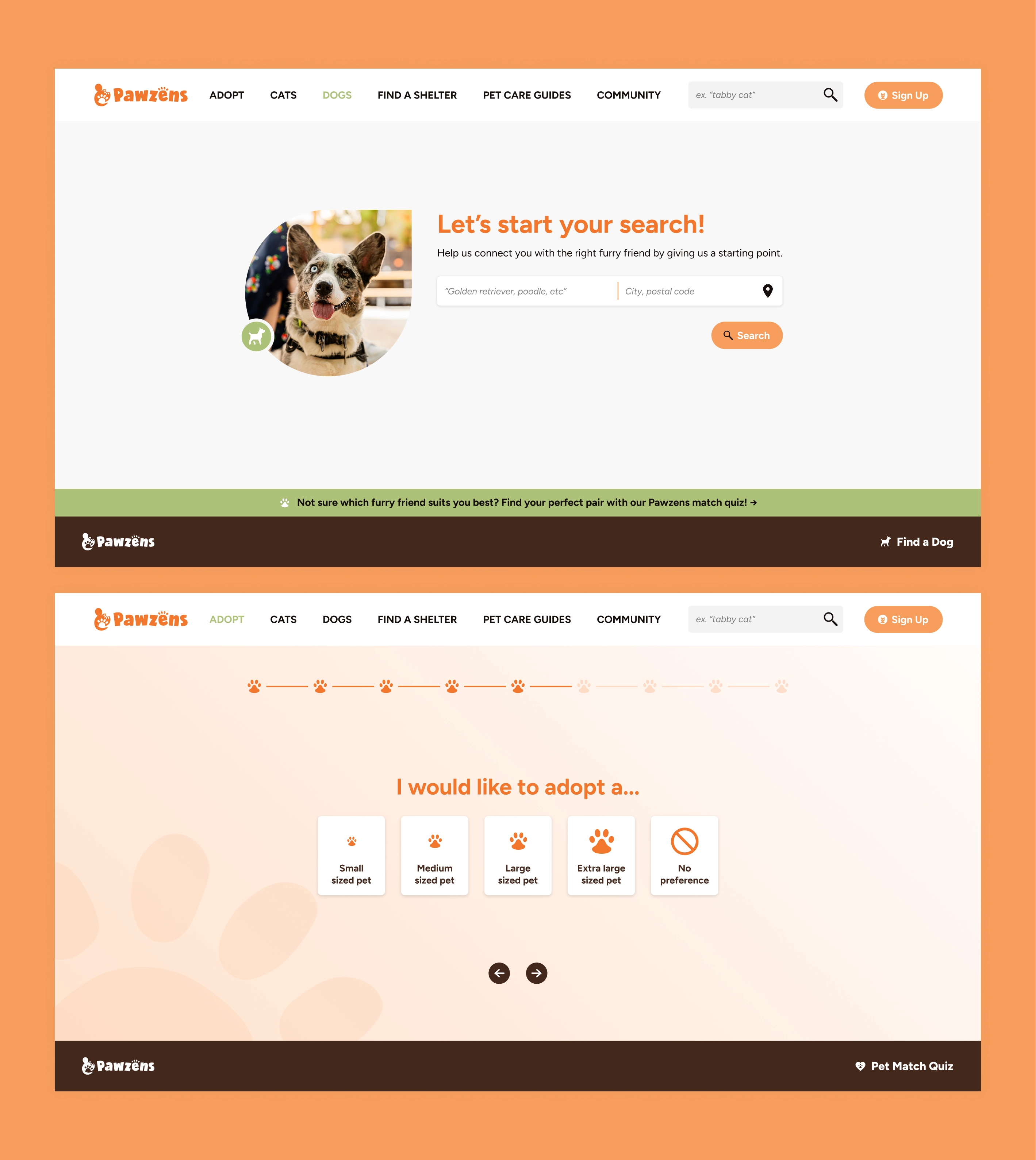 The interface of PAWZENS combines layouts from existing adoption platforms like Petfinder and Adopt a Pet, drawing on user familiarity to make the website easier to visually interpret; imagery and icons used were also sourced to match existing platforms. Rounded forms and shapes were included to match with the PAWZENS logo; component elements (buttons, cards, dropdowns) also used curved edges. It was important to emphasize playfulness with modernity, revitalizing adoption platform interfaces while keeping the content at the forefront.