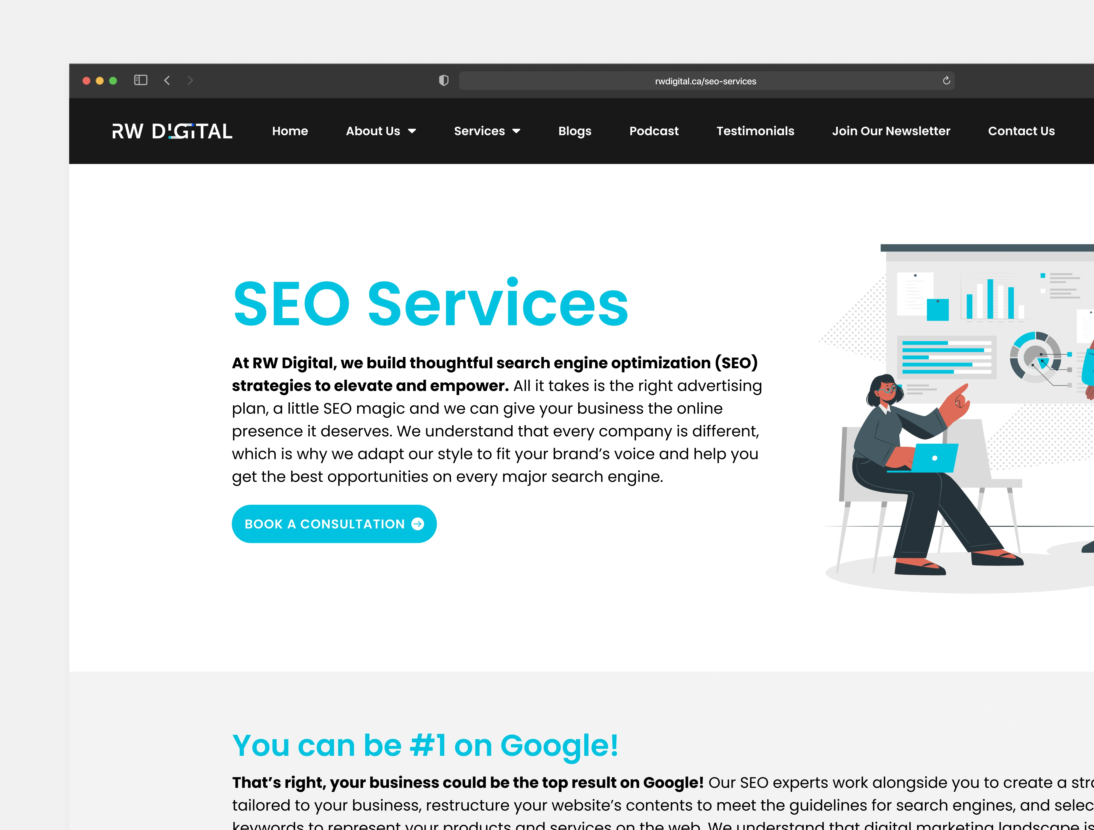 Given the agency's main channels of communication are through its website and social media, we devised a goal to make better use of the website to extends its reach. We expanded the website to include service pages for the regions the agency serviced, simplified content to make it easier to understand for viewers, and performed usability checks for responsiveness and accessibility adherence. Additionally, we used language and copy that is easy to understand, encouraging and simplified — all while maintaining a level of professionalism and expertise that marks RW Digital as a leader in the Canadian digital marketing industry.